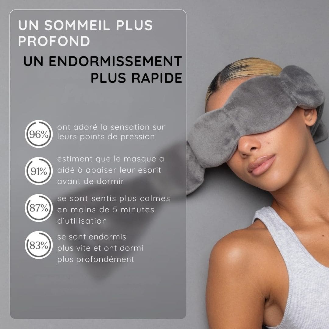 Grâce à son poids réparti uniformément, le masque exerce une pression douce et homogène sur les paupières et les zones proches des yeux : un principe inspiré de la thérapie par pression profonde.
