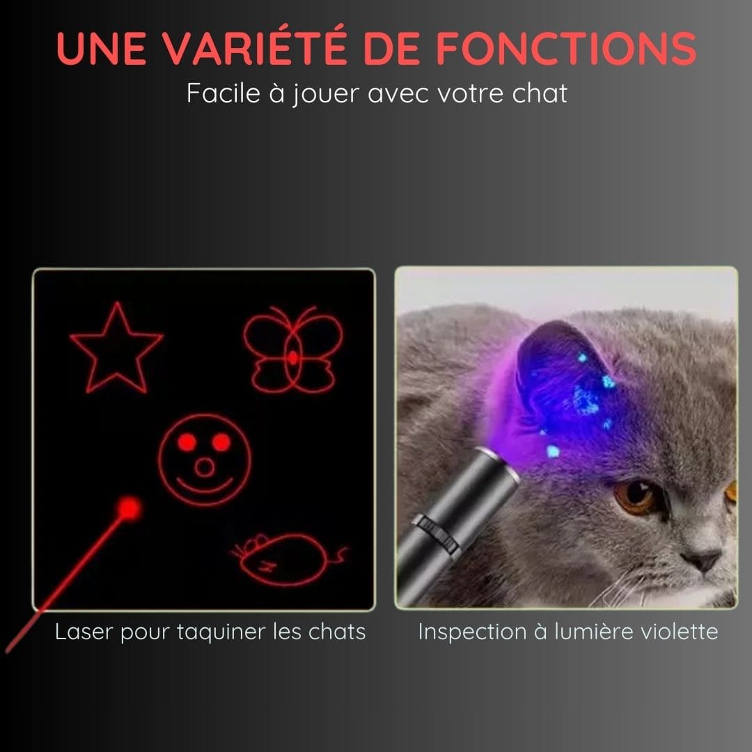 Outre la fonction laser, il intègre une lampe ultraviolette pour vérifier les billets de banque et une mousse de chat commutable pour le fun. Un véritable outil multitâche à emporter partout !